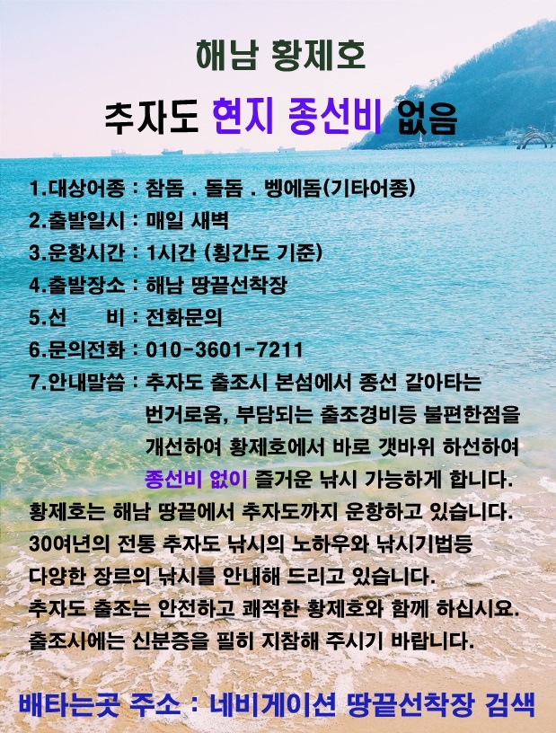 추자도 매일 출조합니다 (현지 종선 없음) 해남황제호 제주 0 68 0 2025.06.05 10:18 ● 출발지: 해남땅끝선착장 ● 목적지: 추자도 ● 대상어종: ● 비용: 8~12 . 0 목록 글쓴이 2 4 Lv.12 해남황제호 프리미엄회원 171,400 (30.4%) 안녕하세요 해남황제호 입니다. 02.10 추자도 매일 출조합니다 (현지 종선 없음) 02.09 추자도 매일 출조합니다 (현지 종선 없음) 02.04 추자도 매일 출조합니다 (현지 종선 없음) 02.02 추자도 매일 출조합니다 (현지 종선 없음) 01.29 추자도 매일 출조합니다 (현지 종선 없음)
