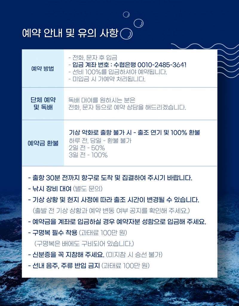 ※ 계좌 번호 : 수협 0010-2485-3641 이승환 (입금 순서대로 우선 예약됩니다.)