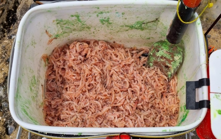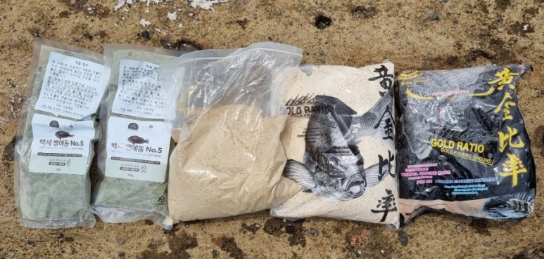 긴꼬리 벵에돔이 대상어였기 때문에 크릴의 원형을 최대한 살려 밑밥을 준비했습니다. 방어덕의 깊은 수심과 벵에돔의 낮은 활성도를 고려하여 황금비율 감성돔 집어제를 선택했고요. 벵에돔 부재료 설화 1봉에, 미강 가루 1봉, 여수 대회에서 수령했던 "낚시백세"의 벵에돔 부재료도 2봉 같이 넣어줬습니다.