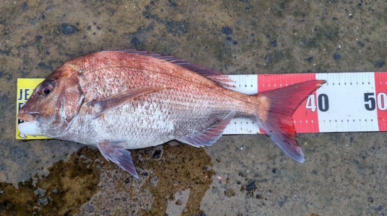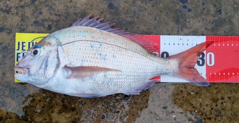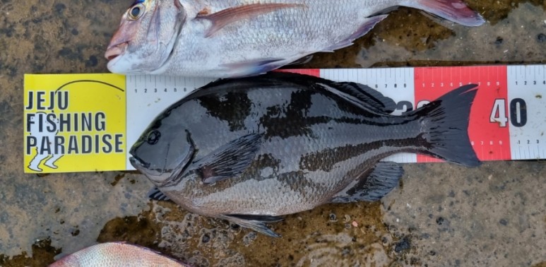 40cm가 넘는 참돔이 올라왔네요. 이날 04번 찌 이상의 침력을 가진 잠길찌 채비를 사용하여 중층 아래의 수심을 노다고 합니다.