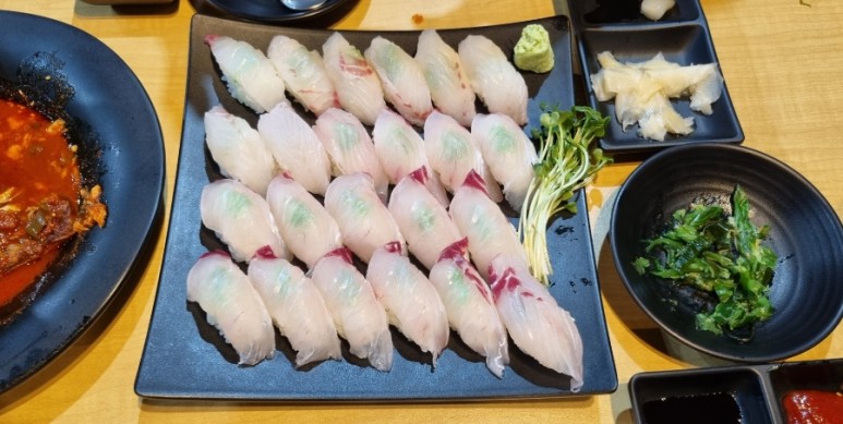 참돔 초밥이 이어서 제공되었습니다. 보통의 초밥에서는 흔치 않은 자연산 활어 초밥이었습니다. 초밥 위에 올려진 참돔 횟감이 두툼해서 씹는 맛이 좋았습니다 ^^V
