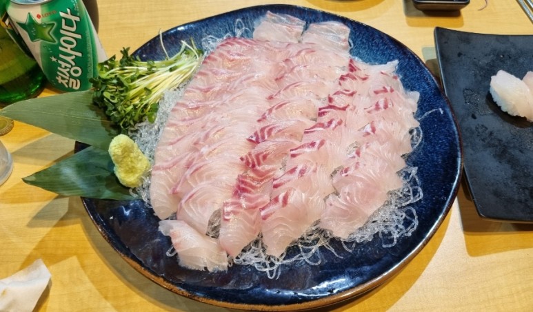 벵에돔 회 한점에 와사비를 조금 올려서 무순과 같이 먹으니 정말 맛있었습니다. 씹을수록 고소한 맛이 느껴졌는데, 사장님이 손질하면서도 기름기가 많아서 칼에 묻어 나올 정도였다고 합니다.