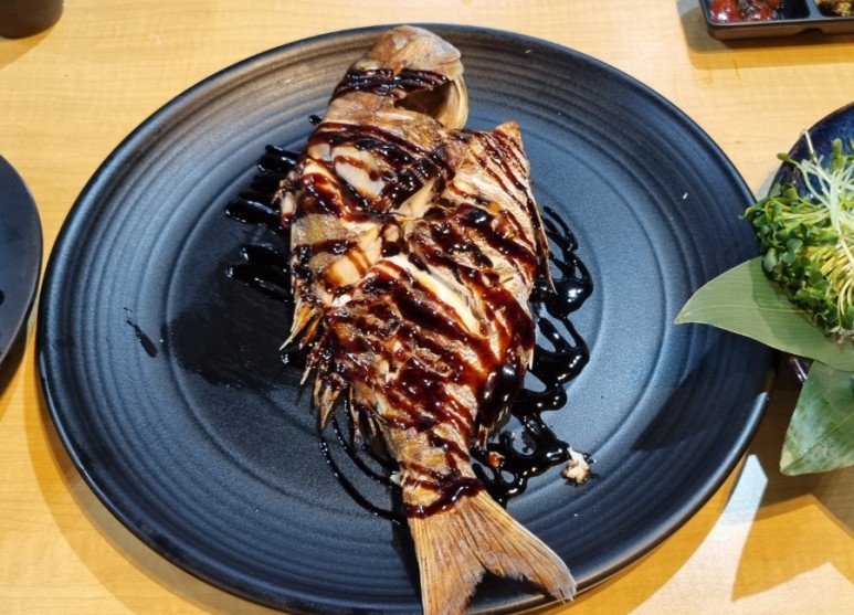 이어서 참돔 한 마리는 통째로 구워 특제 소스를 올려 주셨고, 회를 치고 나온 참돔 살들은 따로 튀겨 탕수로 만들어 주셨습니다.