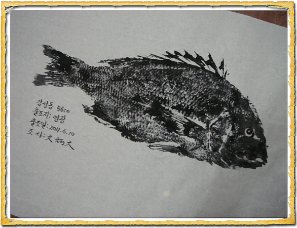 그러면 이렇게 멋진 어탁이 완성됩니다""먹물이 마른후 눈만 따로 그려주면 끝""출조날짜가 잘 못 적혔네요""