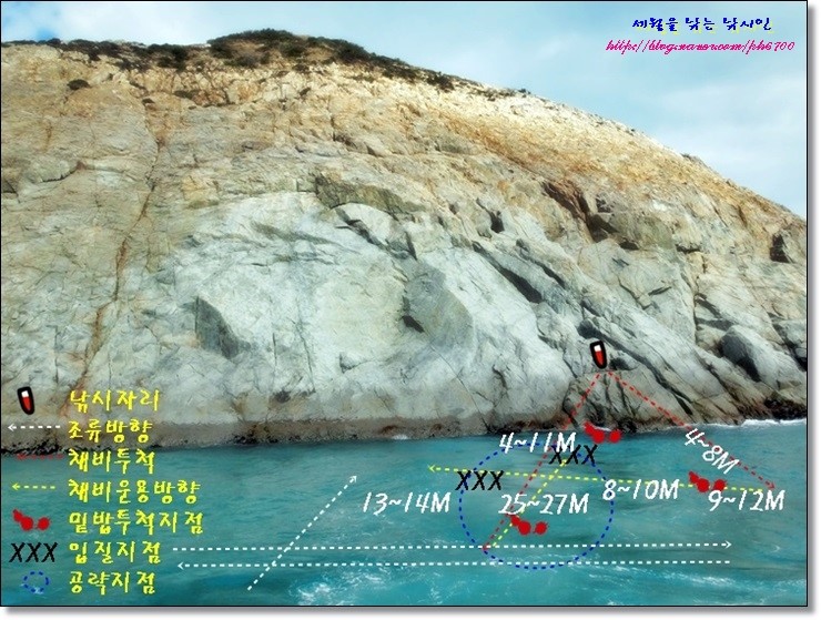 우측장타 수심 17m권에서 참돔...........우측 작은홈통 부근 수심 9m권 감성돔이 나온다는 가이드님 조언