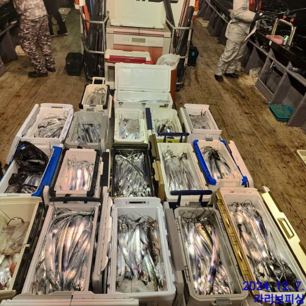12월06일(금) 출조후기 열아홉조우님 모시고 홍도동쪽으로 비교적 멀리 출조하였습니다..시작부터 마칠때까지 꾸준한 히팅~♡♡늦게 출항하여 5시까지 할 계획이었으나 6시정각까지 하게되네요~~시작부터 끝까지 바람과 높은너울이 일었음에도 올리시는 조우님은 인타발 꾸준한 히팅..4지~4.5지도 많이 올라왔습니다~~♡♡♡한치는 중치가 많았습니다~♡♡몇몇조우님께서는 멀미에 선실을 자주이용 ㅠ개인별 조과차이가 제법 나는 하루....참고로 카리브피싱은 겨울이라 완전 얼음밑바닥입니다.얼음을 절반깔면 만쿨이상입니다~~♡♡♡오늘 함께하신 조우님들 고생많으셨습니다 ^*^12월07일(토) 출조는 풍랑예비특보로 인해 하루쉬어갑니다..  예약하신 조우님들께는 개별적으로 연락드리겠습니다http://caribe.sunsang24.com/