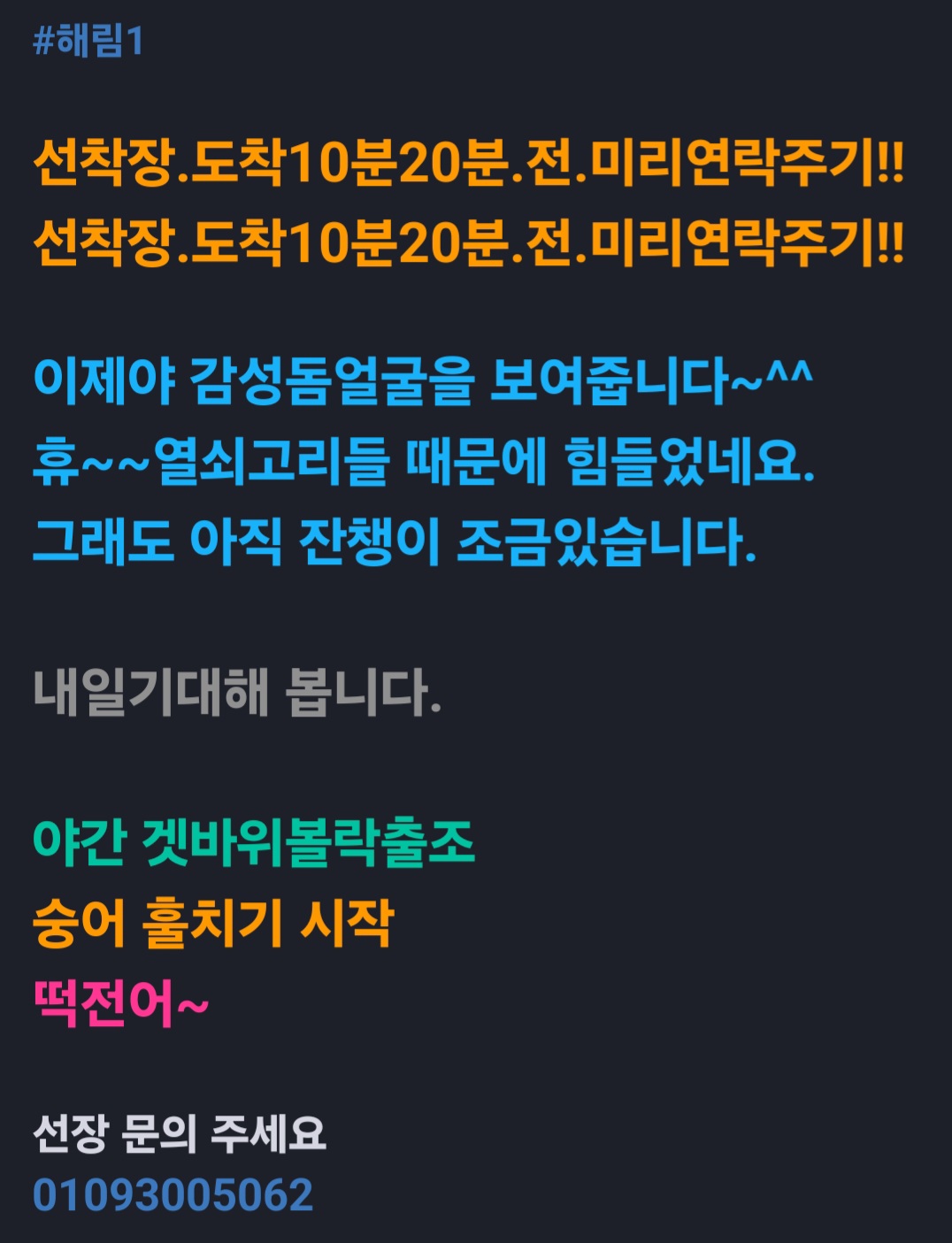 - 당일 조황을 올리셔야 합니다. - 지난 조황은 2일이내 미등록 조황만 가능합니다. - 이미 올린 조황을 붙여넣기하여 계속 등재하시면 중복조황에 해당합니다. - 당일 조황을 올리면서 이전 조황을 같이 올리면 중복조황에 해당합니다. - 조황없는 출조정보는 출조정보 게시판을 이용하시길 바랍니다. - 올린 글 삭제하고 다시 올려 상단에 올리려는 방법, 이용규칙 위반입니다. - 제목에 특수문자 사용하시면 안됩니다. (온점, 쉼표, 느낌표, 괄호, 물결만 허용) ☆ 공지사항에 '조황등재시 유의사항' 게시글을 꼭 확인하시고 조황작성 부탁드리며, 가장 기본적인 규칙이 지켜지지 않을 시 예고없이 글 삭제 및 이용정지 될 수 있음을 알려드립니다. |