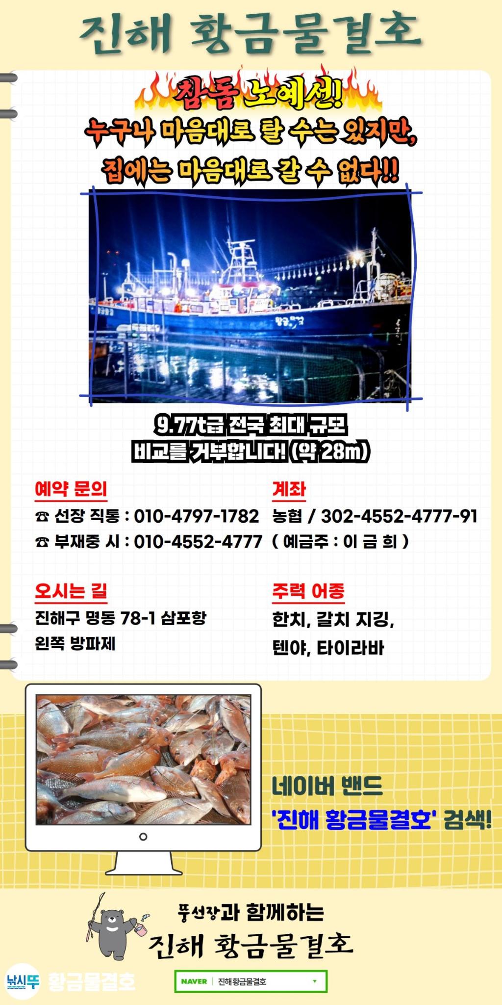 F T V 통신원 진해 황금물결호 뚱선장 매일 매일 조황과 소식등은 밴드에서 보세요~ 참돔 타이라바 매일 출항 이번주 수.목.금.일 무조건출항 주말 예약은 서둘러주세요. 참돔 100만원을 잡아라~!! 이벤트 하고잇습니다.