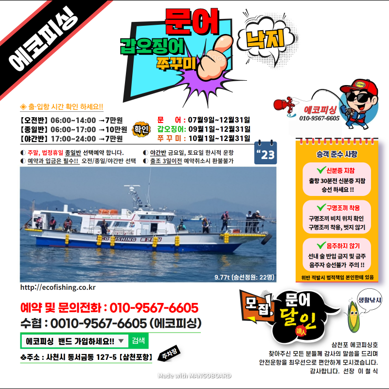 삼천포 선상낚시 에코피싱호 인사드립니다. 진실된 조황 안전운항으로 모시겠습니다. -문어/갑오징어/쭈꾸미/참돔/감성돔/뽈락