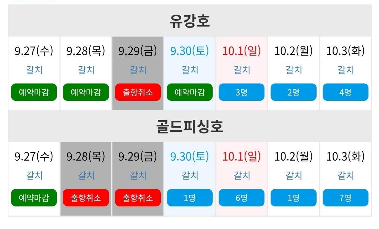▶ 9월 27일 (수) 골드피싱호 (예약완료), 유강호 (예약완료) ▶ 9월 28일 (목) 골드피싱호 (휴무), 유강호 (예약완료) ▶ 9월 29일 (금) 휴무 ▶ 9월 30일 (토) 골드피싱호 (01자리 여유), 유강호 (예약완료) ▶ 10월 1일 (일) 골드피싱호 (06자리 여유), 유강호 (03자리 여유) ▶ 10월 2일 (월) 골드피싱호 (01자리 여유), 유강호 (02자리 여유) ▶ 10월 3일 (화) 골드피싱호 (07자리 여유), 유강호 (04자리 여유)