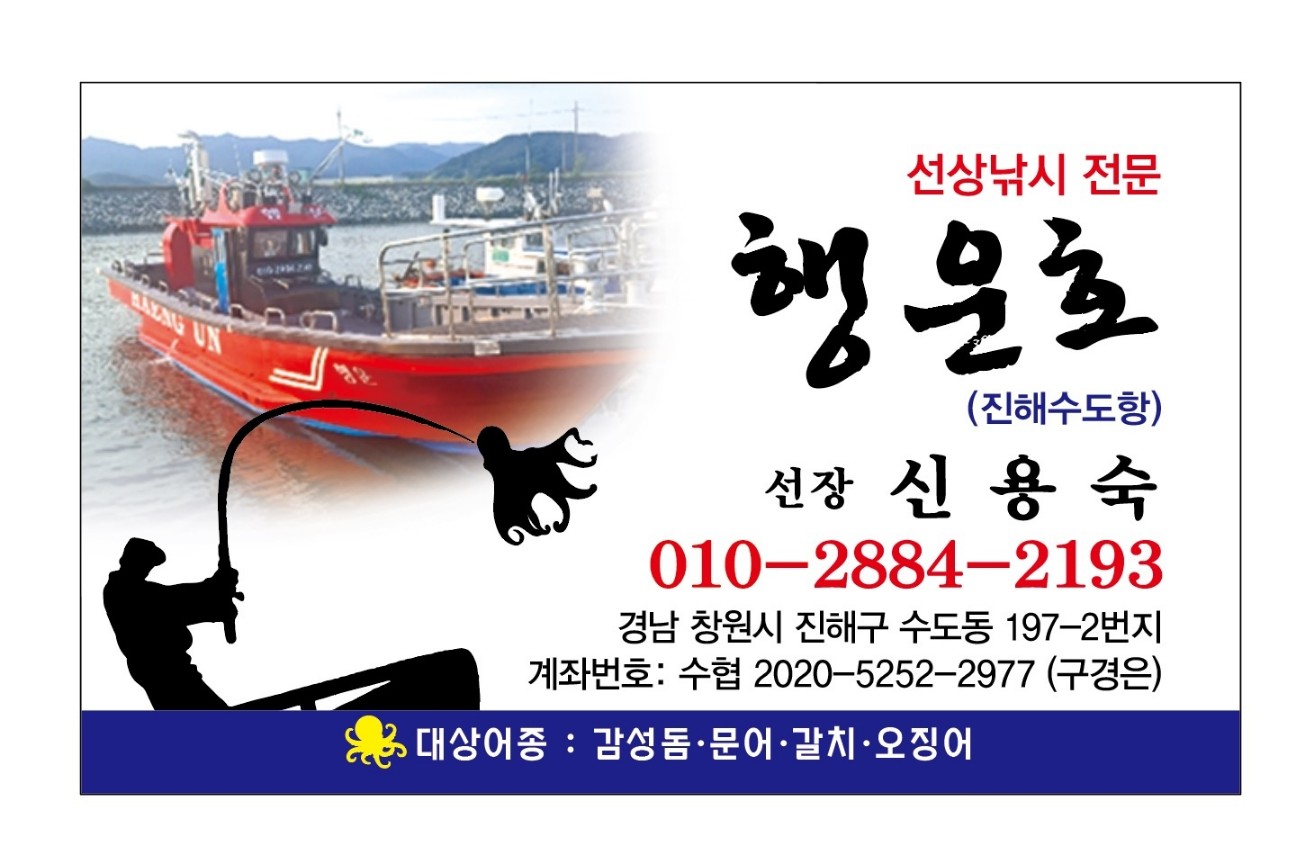 모든 낚시인 여러분 진해 행운호(수도항) 페이지에 오신걸 환영합니다. 행운호 (진해수도항) -선상낚시 전문 선장 - 신용숙 | 01028842193 대상어종 : 감성돔 문어 갈치 오징어