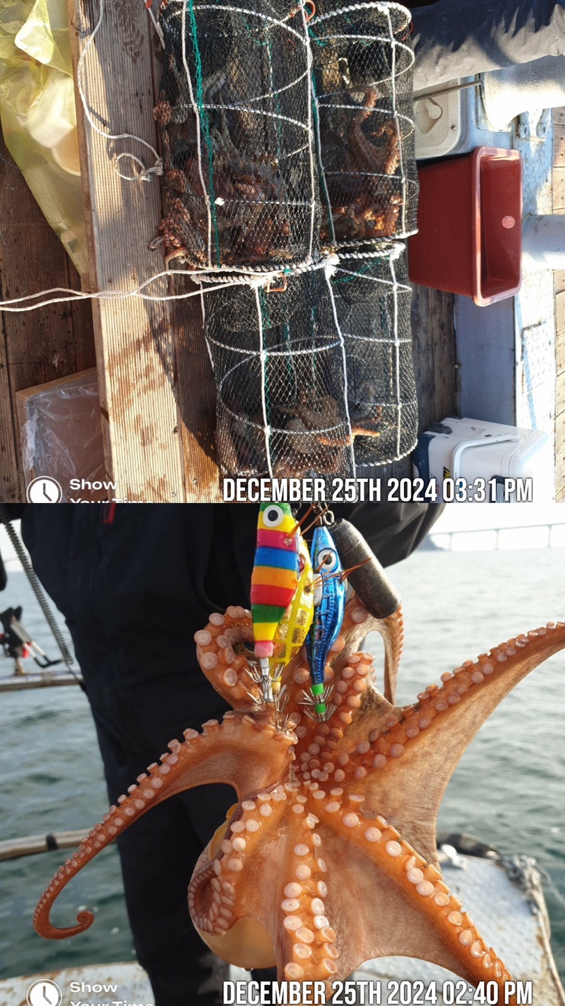 12월25일 내만문어 조황입니다 오랜만에 날씨도 좋고  물때도 좋고 손님들도 좋고  즐낚하고 왔습니다 8수 7수 5수 5수 막바지 내만문어 조금나와주네요 1시간 연장하고 왔습니다 이번주말까지는 출항합니다 연락주세요