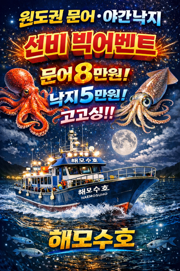 올해 막달 첫날 5시 덩치급 야간문어출조 대박한번 터트려 보입시더 날씨도 최상입니다 현재 13자리여유 태평양 얼른 전화주이소~ | |||||||||||||||||||