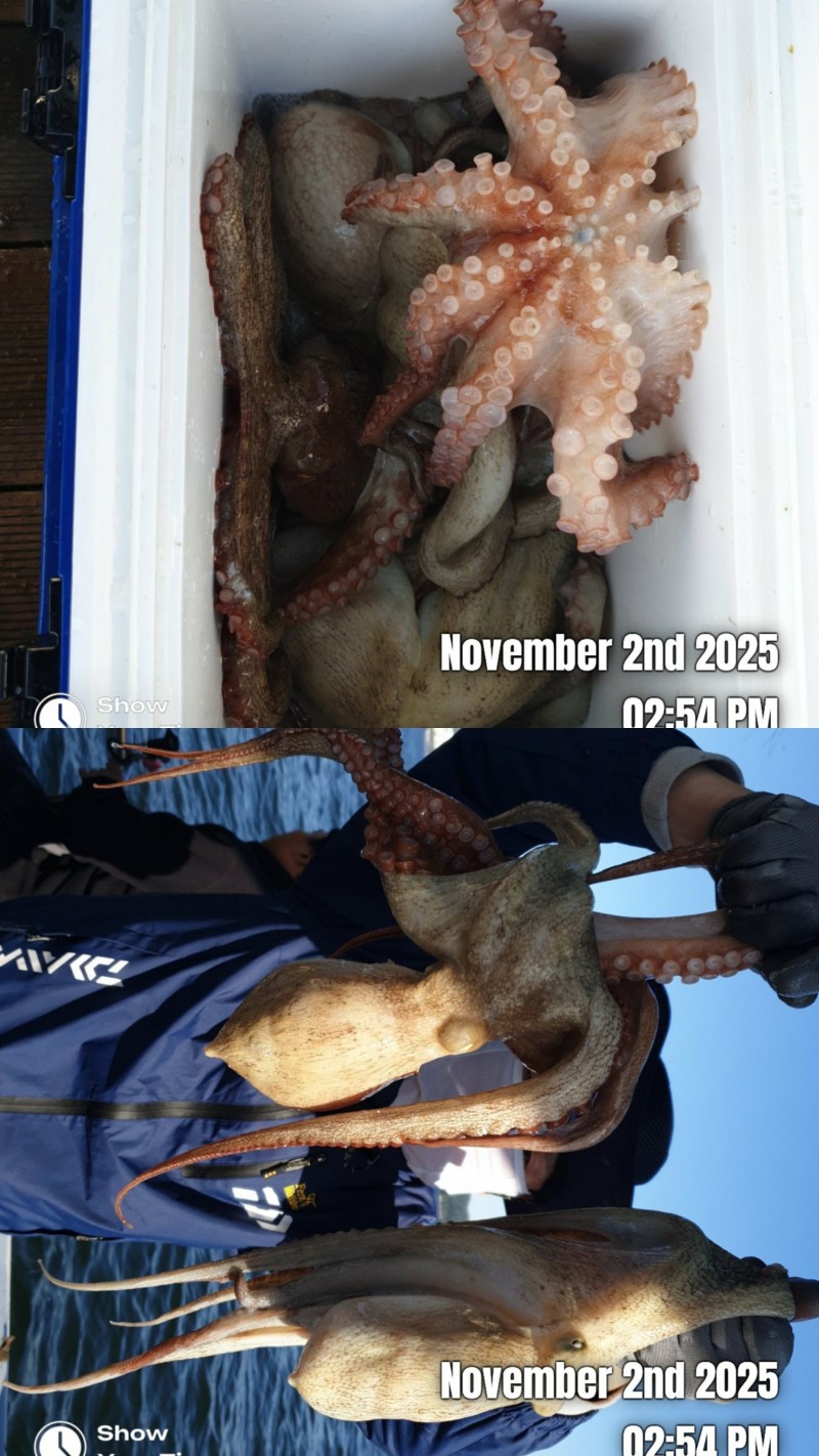 11월2일 일요일 오전문어 조황입니다 요즘은 바람통에 낚시하기 힘드네요 ~ 2키로 1키로500 1키로300 등등 키로급들 중치급이상 조금잡고 왔습니다 두자리이상 하신분들도 3분계시고 초보조사님 2키로급들 문어 잡으셨어요