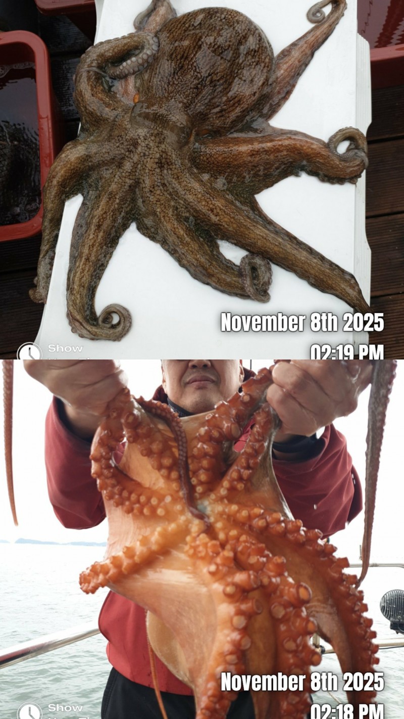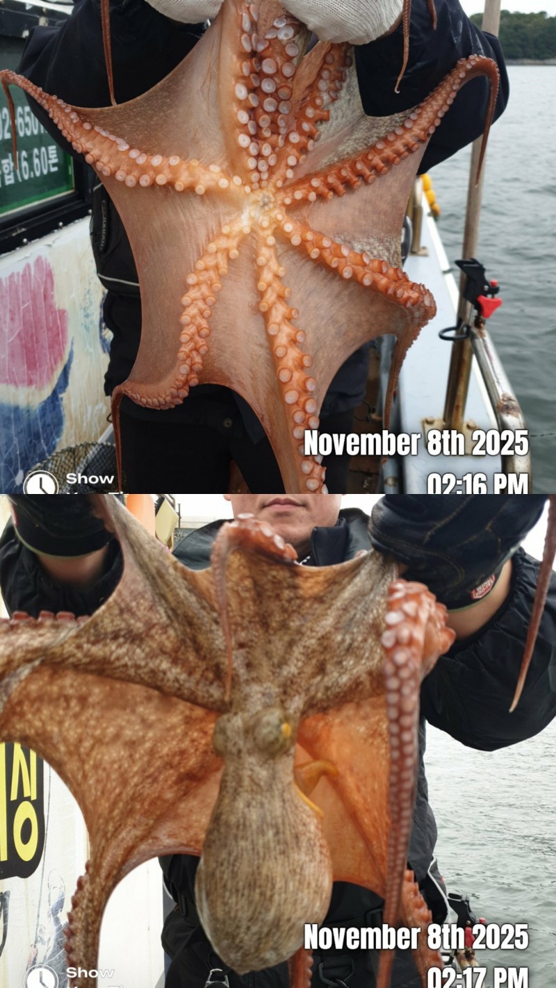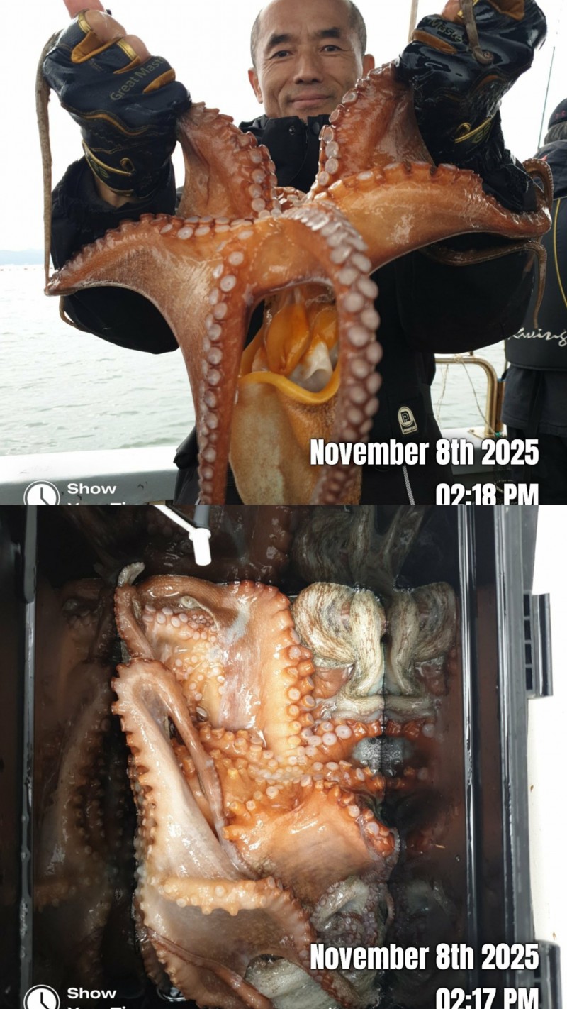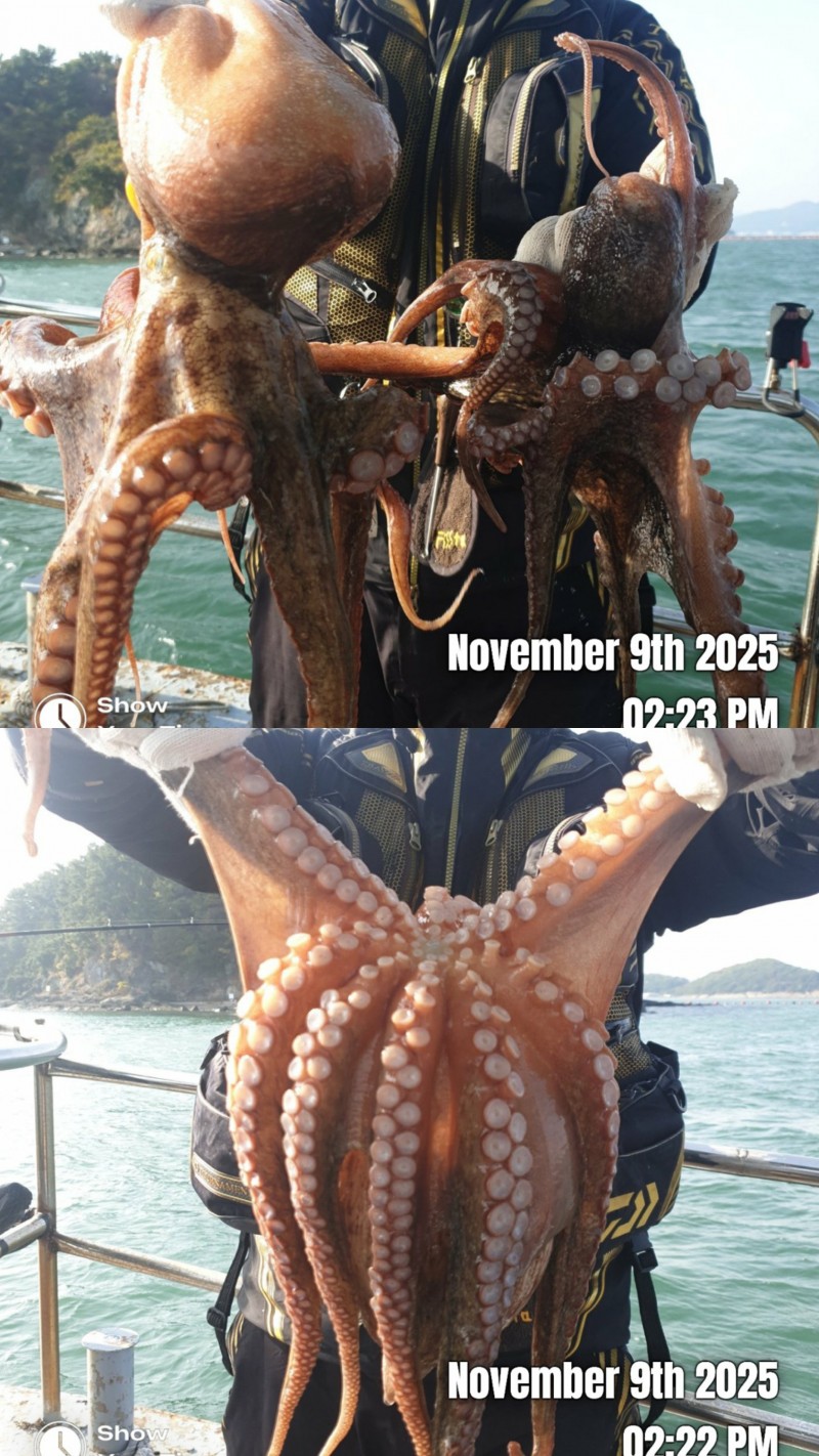 11월8일 토요일 오전문어 조황입니다 사리물때 빠른조류에 바람통에 힘들었네요 개인 몇수씩 하고왔습니다 2키로 1키로800 1키로700 1키로500 1키로300 등등 키로급들 중치급이상 조금잡고 왔습니다 내일부터는 물때도 좋아지고 날씨도 좋아지네요