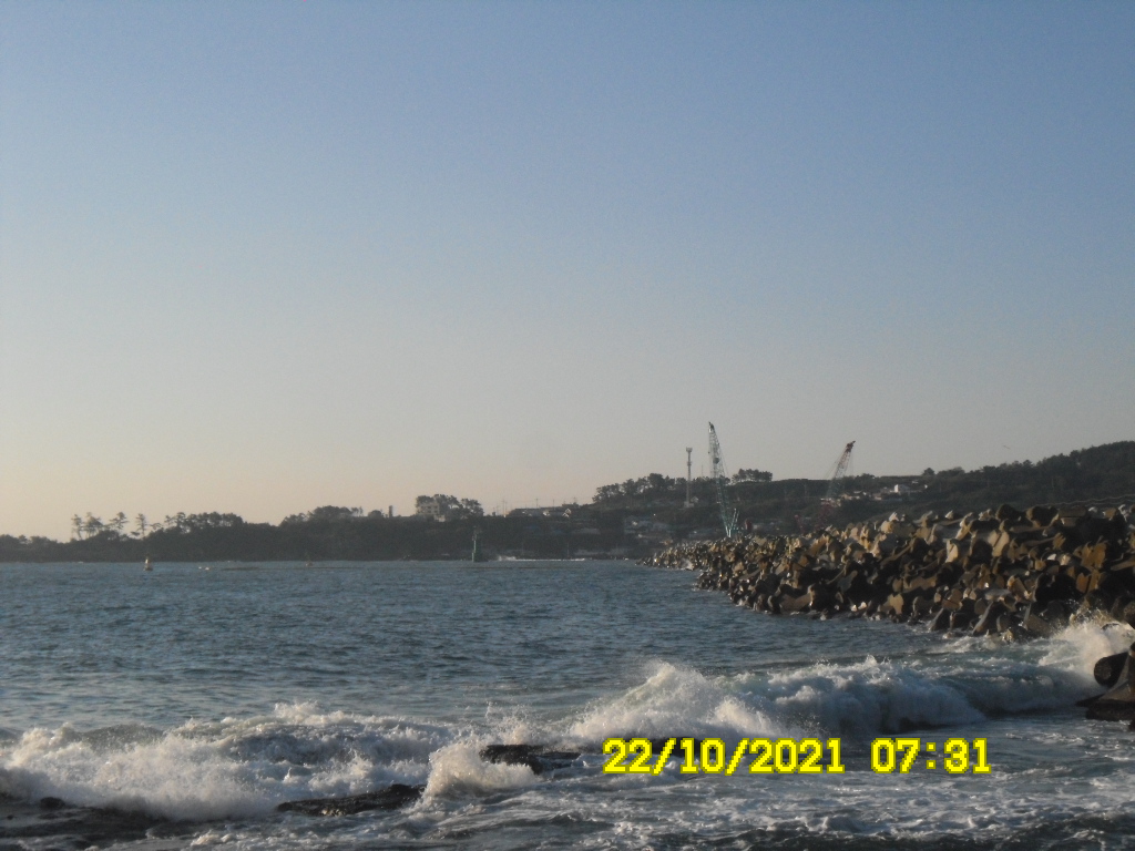 바다는 약한 너울이 있고 물색이 흐리며 서풍이 약하게 부는 맑은 아침입니다.