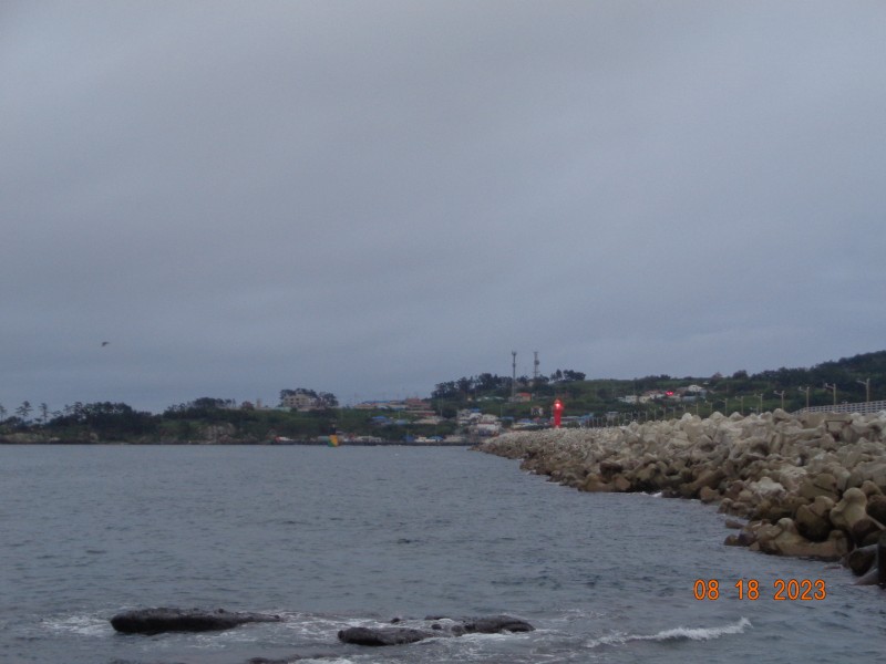 바다는 약한 너울이 있고 물색이 좋으며 바람이 거의 없는 흐린 아침입니다.