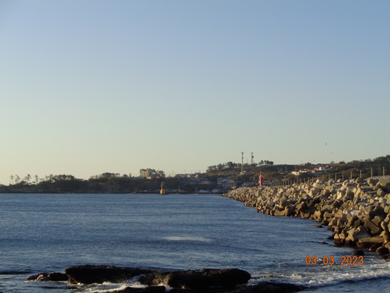 바다는 잔잔하고 물색이 맑으며 북서풍이 다소 부는 맑은 아침입니다.