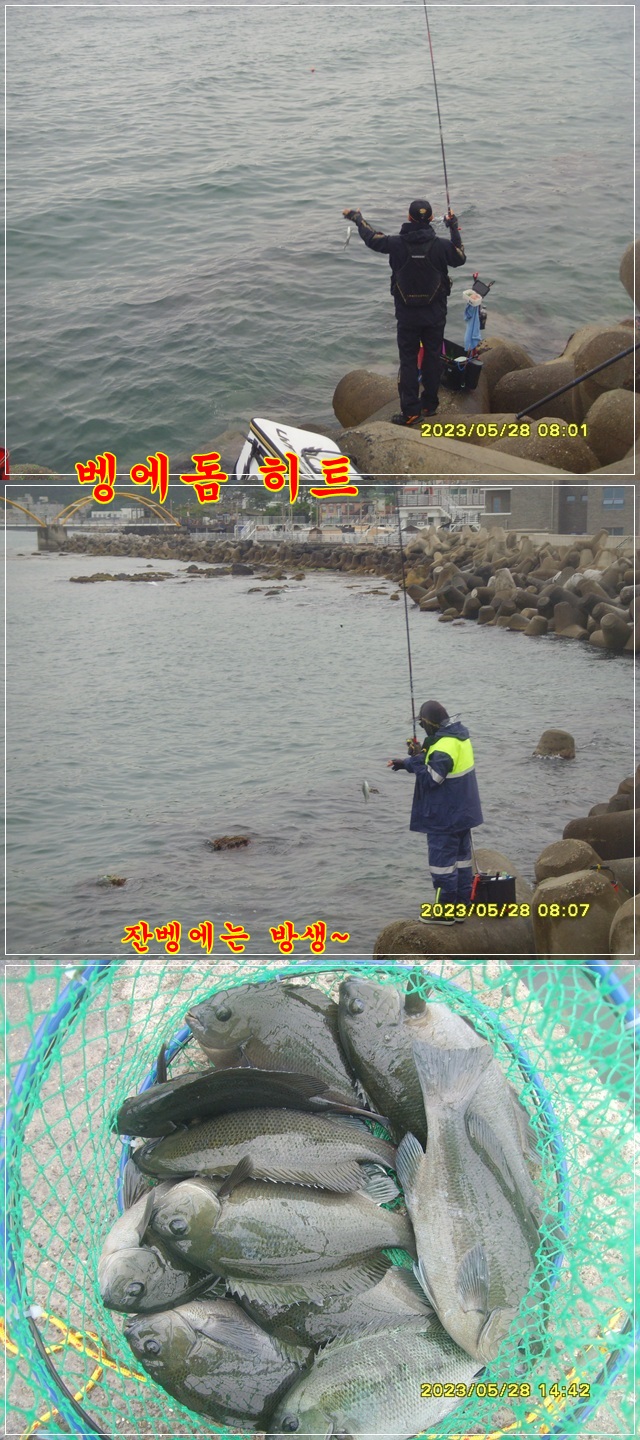 이른아침엔 잡어들 등살에짜낚 조금지나 비가그치니 벵에돔이 따문따문 올라오네요