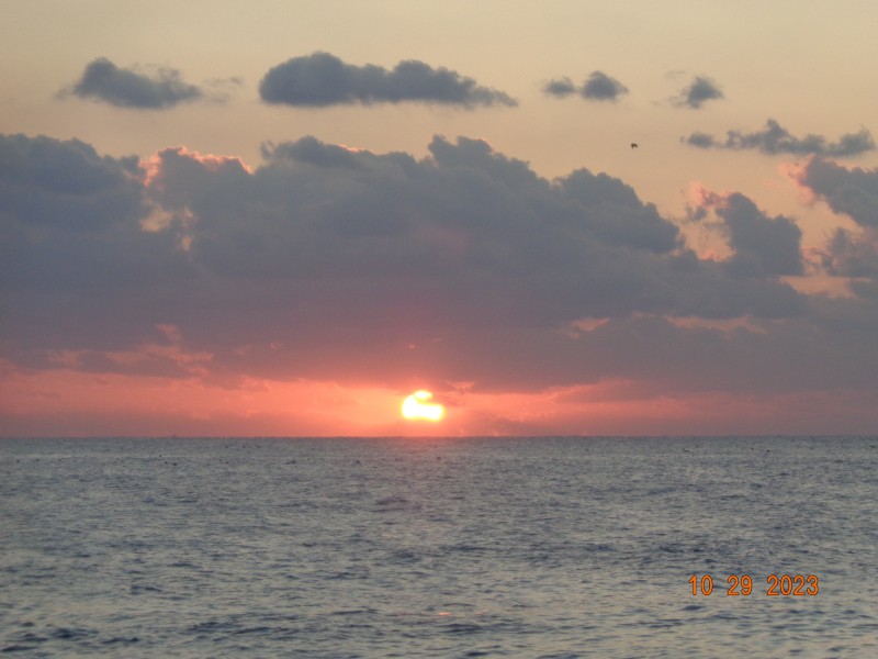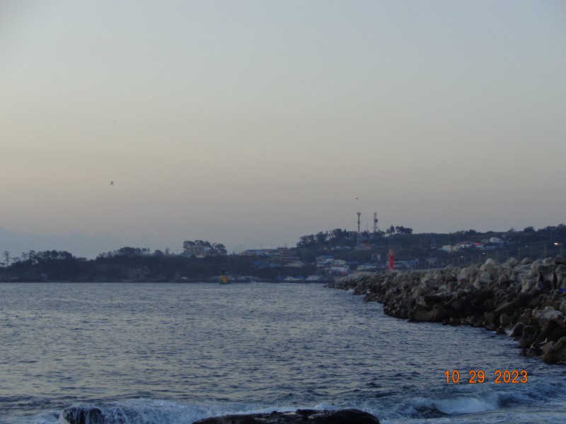 바다는 약한 너울이 있고 물색이 맑으며 북서풍이 약하게 부는 맑은 아침입니다.