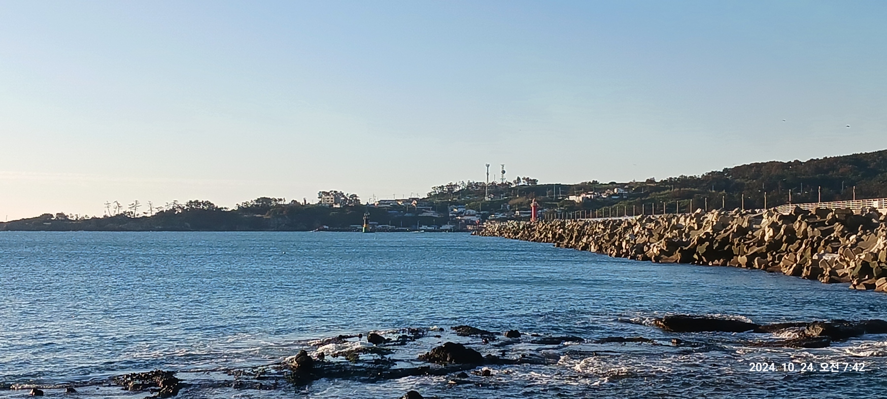 바다는 잔잔하고 물색은 맑으며 북서풍이 약하게 부는 맑은 아침입니다.