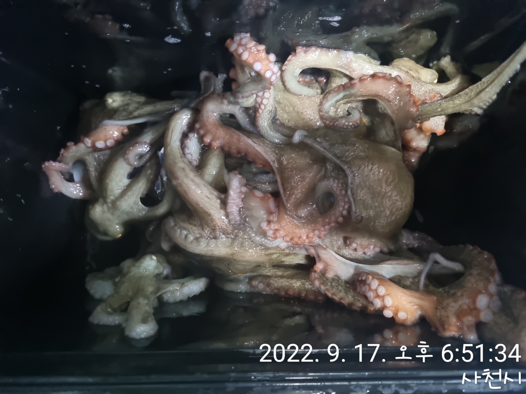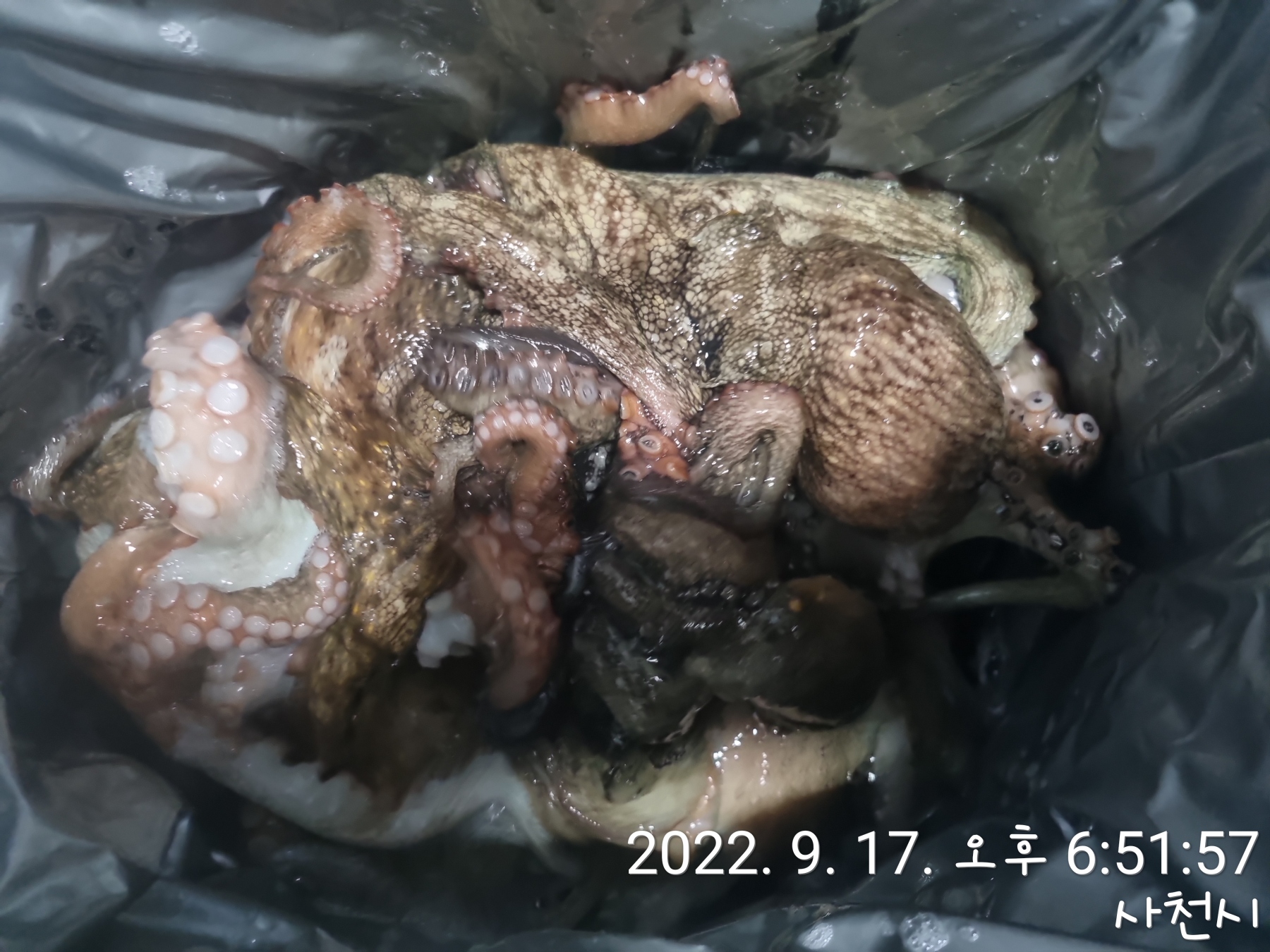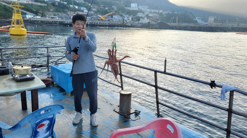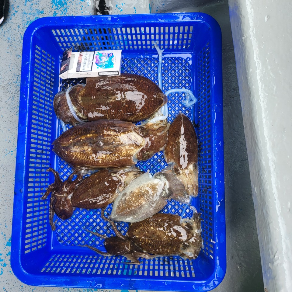 어제 야간 좌대에서 잡은 갑오징어, 문어 등이 제법 올라왔습니다.