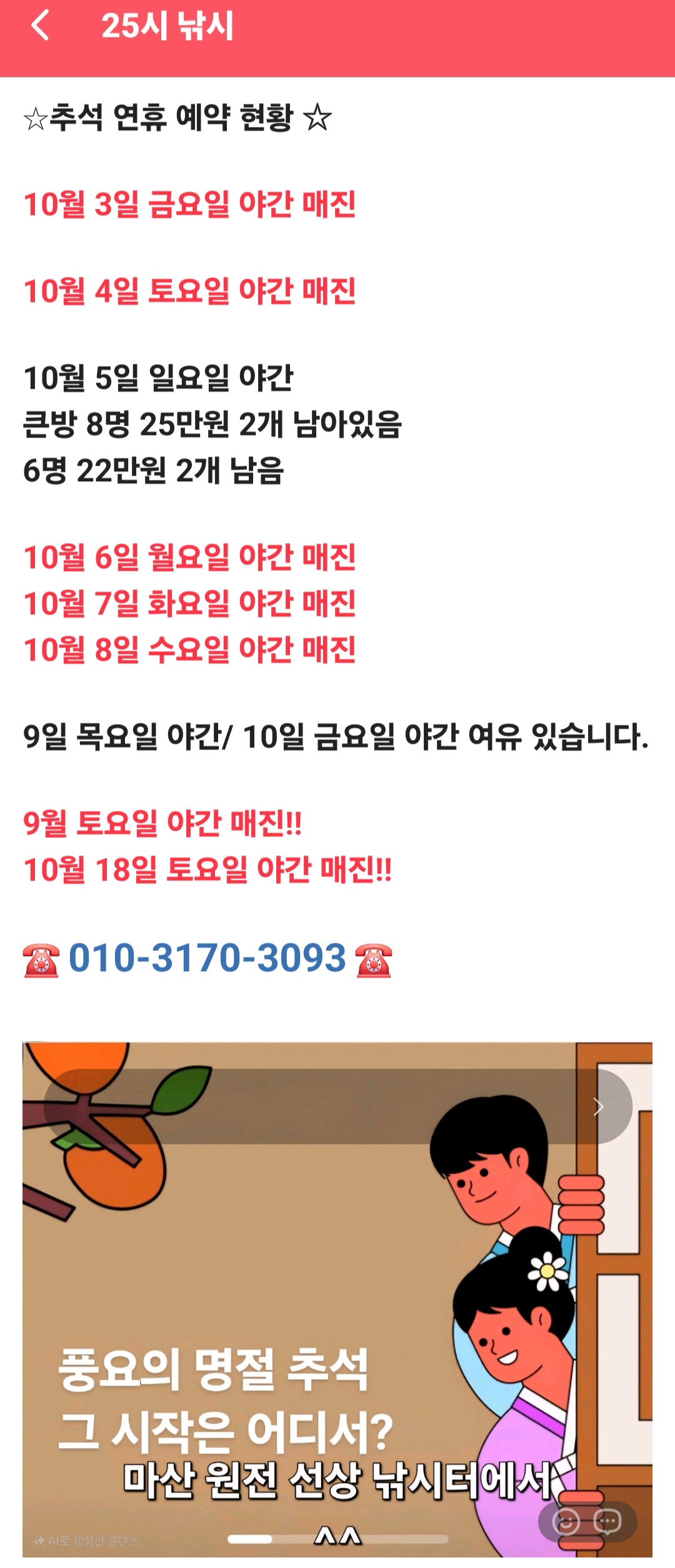 9월 토요일 야간은 매진입니다.