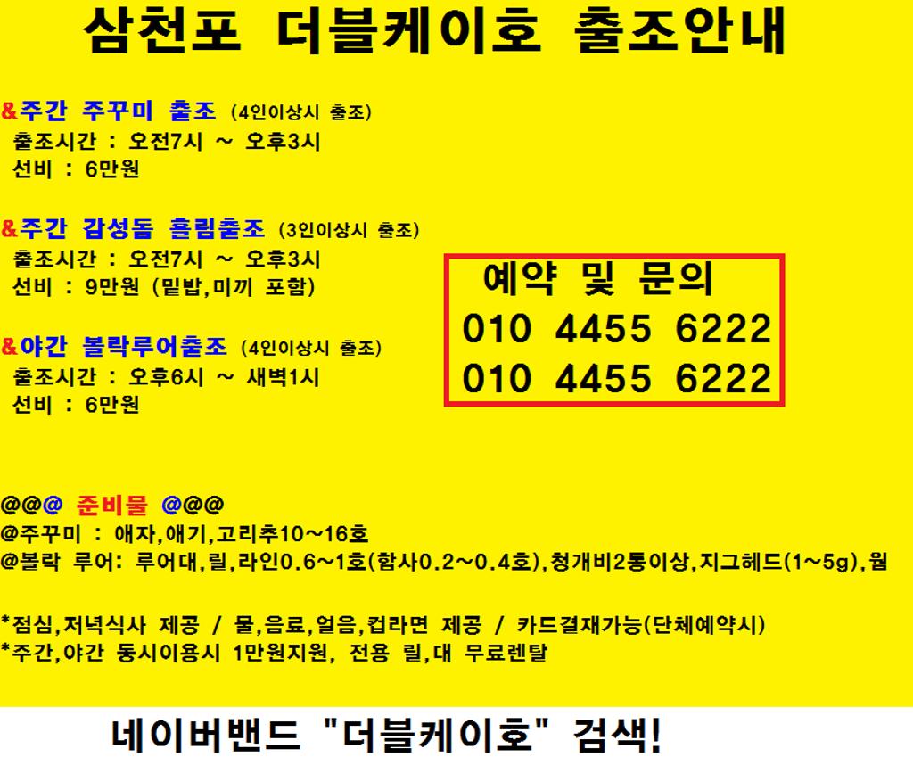 내일아침 주꾸미출조하구요~ 9자리여유 남아있네요^^ 오전7시 ~ 오후3시 출조하실 조사님 예약주세요~ 010 4455 6222 010 4455 6222 (삼천포 더블케이호 주간 주꾸미, 감성돔흘림, 야간볼락루어 출조안내) 010 4455 6222 010 4455 6222 (볼락루어로 25cm이상, 털털이로 29cm이상, 평일 무료승선권 지급!) (단, 6인 이상시출시 지급, 1일 1인 1매만 지급 가능) (((********평일,주말 주간,야간 독배문의 환영! 카드결재가능!********))) 〓〓〓〓〓〓〓〓〓〓〓〓〓〓〓〓〓〓〓 ⭐️⭐️⭐️⭐️⭐️⭐️⭐️⭐️⭐️⭐️⭐️⭐️⭐️⭐️ 〓〓〓〓〓〓〓〓〓〓〓〓〓〓〓〓〓〓〓 12월7일 화: 주간 주꾸미 9자리여유, 감성돔흘림 자리여유 12월8일 수: 주간 주꾸미 자리여유,감성돔흘림 자리여유 12월9일 목: 주간 주꾸미 10자리여유,감성돔흘림 자리여유 12월10일 금: 주간 주꾸미 자리여유 , 감성돔흘림 자리여유 ,야간 볼락루어 자리여유 12월11일 토: 주간 주꾸미 1,2호 예약완료 , 야간 볼락루어 자리여유 12월12일 일: 주간 주꾸미 1,2호 예약완료 , 야간 볼락루어 자리여유 12월13일 월: 주간 주꾸미 자리여유,감성돔흘림 자리여유, 야간 볼락루어 자리여유 12월14일 화: 주간 주꾸미 자리여유 ,감성돔흘림 자리여유, 야간 볼락루어 자리여유 12월15일 수: 주간 주꾸미 자리여유 ,감성돔흘림 자리여유, 야간 볼락루어 자리여유 12월16일 목: 주간 쭈 자리여유 ,감성돔흘림 자리여유, 야간 볼락루어 자리여유 12월17일 금: 주간 쭈 자리여유 ,감성돔흘림 자리여유, 야간 볼락루어 자리여유 12월18일 토: 주간 쭈 자리여유 ,감성돔흘림 자리여유, 야간 볼락루어 자리여유 12월19일 일: 주간 쭈 자리여유 ,감성돔흘림 자리여유, 야간 볼락루어 자리여유 12월20일 월: 주간 쭈갑 자리여유 , 야간 볼락루어 자리여유 12월21일 화: 주간 쭈갑 자리여유 , 야간 볼락루어 자리여유 12월22일 수: 주간 쭈갑 자리여유 , 야간 볼락루어 자리여유 12월23일 목: 주간 쭈갑 자리여유 , 야간 볼락루어 자리여유 12월24일 금: 주간 쭈갑 자리여유 , 야간 볼락루어 자리여유 12월25일 토: 주간 쭈갑 자리여유 , 야간 볼락루어 자리여유 12월26일 일: 주간 쭈갑 자리여유 , 야간 볼락루어 자리여유 12월27일 월: 주간 쭈갑 자리여유 , 야간 볼락루어 자리여유 12월28일 화: 주간 쭈갑 자리여유 , 야간 볼락루어 자리여유 12월29일 수: 주간 쭈갑 자리여유 , 야간 볼락루어 자리여유 12월30일 목: 주간 쭈갑 자리여유 , 야간 볼락루어 자리여유 12월31일 금: 주간 쭈갑 자리여유 , 야간 볼락루어 자리여유 〓〓〓〓〓〓〓〓〓〓〓〓〓〓〓〓〓〓〓 ⭐️⭐️⭐️⭐️⭐️⭐️⭐️⭐️⭐️⭐️⭐️⭐️⭐️⭐️ 〓〓〓〓〓〓〓〓〓〓〓〓〓〓〓〓〓〓〓 ◆주간 주꾸미,출조 (4인이상시 출조) 출조시간: 오전7시 ~ 오후3시 선비 : 6만원 ◆주간 감성돔흘림 출조 (3인이상시 출조 출조시간 : 오전7시 ~ 오후3시 선비 9만원 (밑밥,미끼포함) ◆야간볼락 루어 출조 (4인이상시 출조) 출조시간: 오후6시 ~ 새벽1시 선비 : 6만원 ◆주간,야간 동시이용시 1만원 지원!◆ **준비물** *주꾸미 : 루어대, 릴, 애자,애기,고리추10~16호 *볼락루어 : 볼락루어대(연질), 릴(1000~1500번), 라인0.6~1호(합사는0.3~0.4호) , 지그헤드(1~5g), 청개비1인 2통이상, 사딘(웜) *털털이 : 3~4미터대, 카드채비3개이상(어피또는 무어피), 청개비2통,고리추10~20호 (장비없으신분은 미리말씀 준비해오세요 모두무료렌탈,가이드 해드릴게요^^) *볼락출조 참고사항* 1.출조 인원이 많을시 낚시대는 1인 한대만 사용부탁드립니다. 2.일반적인 포인트의 수심은 5~10미터 정도 나옵니다 3.털털이 하시는 분들은 낚시배 뒤쪽에 자리잡아 주세요. 4.루어위주의 포인트가 주된 포인트인점 참고해주세요. ◆주간,야간 동시이용시 1만원 지원!◆ (장비없으신분은 미리말씀 준비해오세요 모두무료렌탈,가이드 해드릴게요^^) (((********평일,주말 주간,야간 독배문의 환영! 카드결재가능!********))) 〓〓〓〓〓〓〓〓〓〓〓〓〓〓〓〓〓〓〓 ⭐️⭐️⭐️⭐️⭐️⭐️⭐️⭐️⭐️⭐️⭐️⭐️⭐️⭐️ 〓〓〓〓〓〓〓〓〓〓〓〓〓〓〓〓〓〓〓 @환불규정 2일전 : 100%환불 1일전 : 50%환불 당일취소 : 환불불가 〓〓〓〓〓〓〓〓〓〓〓〓〓〓〓〓〓〓〓 ⭐️⭐️⭐️⭐️⭐️⭐️⭐️⭐️⭐️⭐️⭐️⭐️⭐️⭐️ 〓〓〓〓〓〓〓〓〓〓〓〓〓〓〓〓〓〓〓 삼천포의 출조 안내및 매일 조황이 궁금하다면!? 네이버밴드에 "더블케이호" 를 검색해 주세요^^ 더블케이호 사무장 : 010 4455 6222 (부재시 문자남겨주시면 보는즉시 바로 답변드립니다~) 〓〓〓〓〓〓〓〓〓〓〓〓〓〓〓〓〓〓〓 ⭐️⭐️⭐️⭐️⭐️⭐️⭐️⭐️⭐️⭐️⭐️⭐️⭐️⭐️ 〓〓〓〓〓〓〓〓〓〓〓〓〓〓〓〓〓〓〓 더블케이호 유튜브채널 [해적tv] https://youtu.be/y0bozCuRZuw 삼천포 더블케이호 네이버밴드: https://band.us/@doublek | |||||||||||||||||||