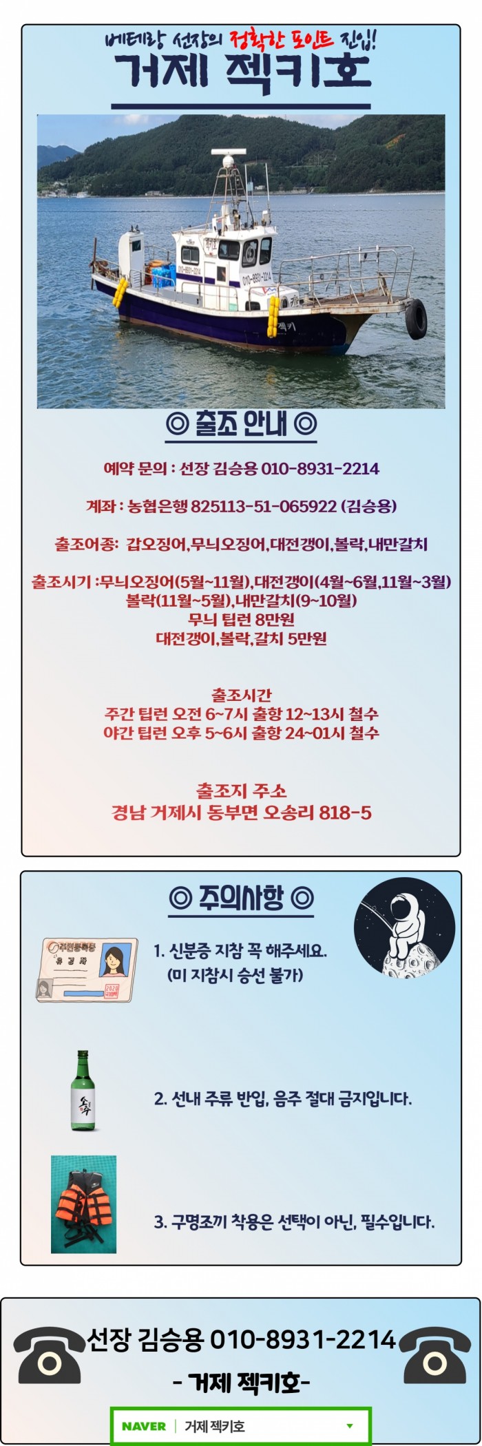 대표 예약번호 010-8931-2214 (선장)