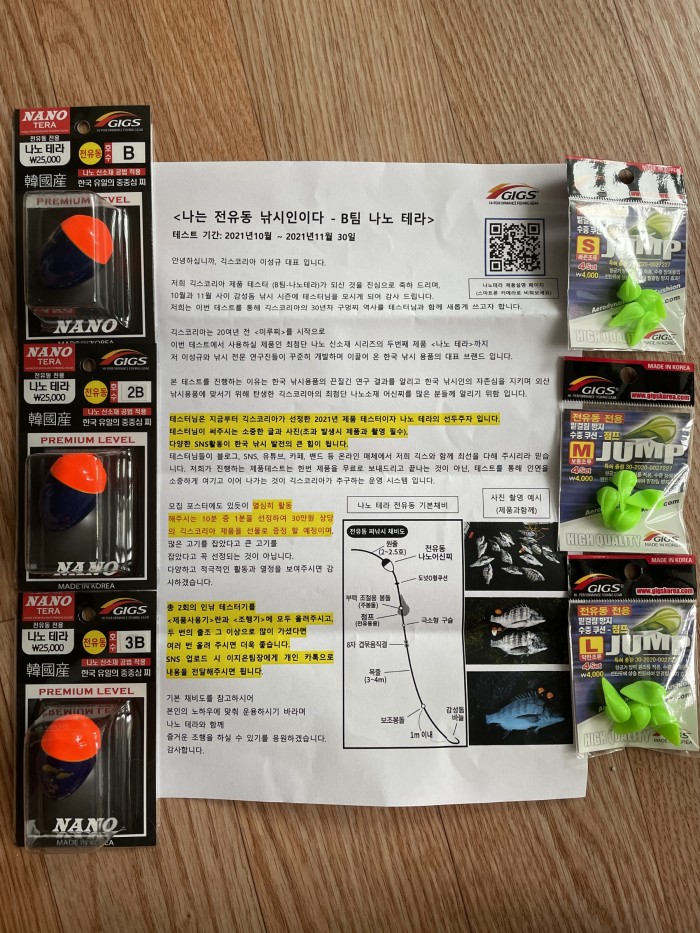 저는 B팀이어서 위 사진과 같이 나노테라 구멍찌 세개 (B/2B/3B)와 긱스코리아 전유동 점프 세개(S/M/L)을 수령하였습니다.