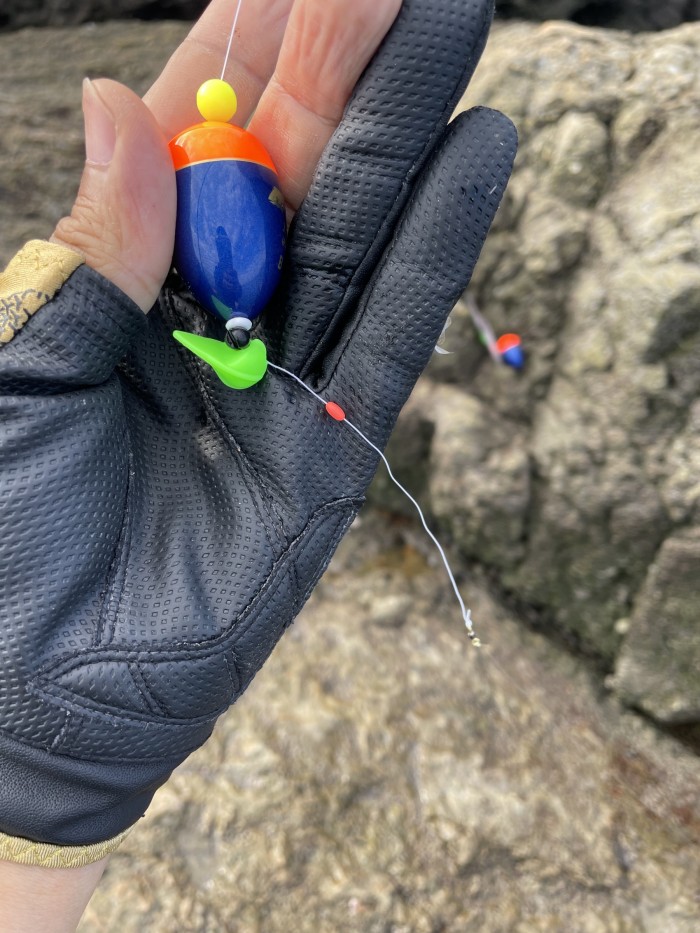 목줄에는 G3봉돌을 하나 물리고 감성돔 3호 바늘에 크릴 미끼를 꿰고 캐스팅 하였을때 찌 상부가 수면과 거의 일치하는 정도의 모습을 보여주었습니다.