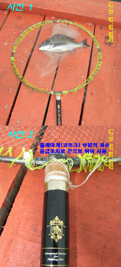 그런데 문제가 발생 합니다. 평가를 위해 시험적으로 몇번 뜰채를 펴고~ 접고... 그러던 중 "코르크" 뜰채 마개가 이상 조짐을 보입니다. ㅜㅜ 뜰채를 접기 위해 1번대 까지 밀어 넣으려는데... 뜰채 후래임을 장착한 상태에서 "코르크" 마개가 이탈되어 땅바닥에 떨어 집니다. "코르크" 마개를 주워 살펴보니... 상하단으로 갈라져 버렸슴니다. 즉. "코르크" 마개가 찧어지는 파손 입니다. 응급 초치로 끈으로 묶어 둡니다. ※사진 2 참조