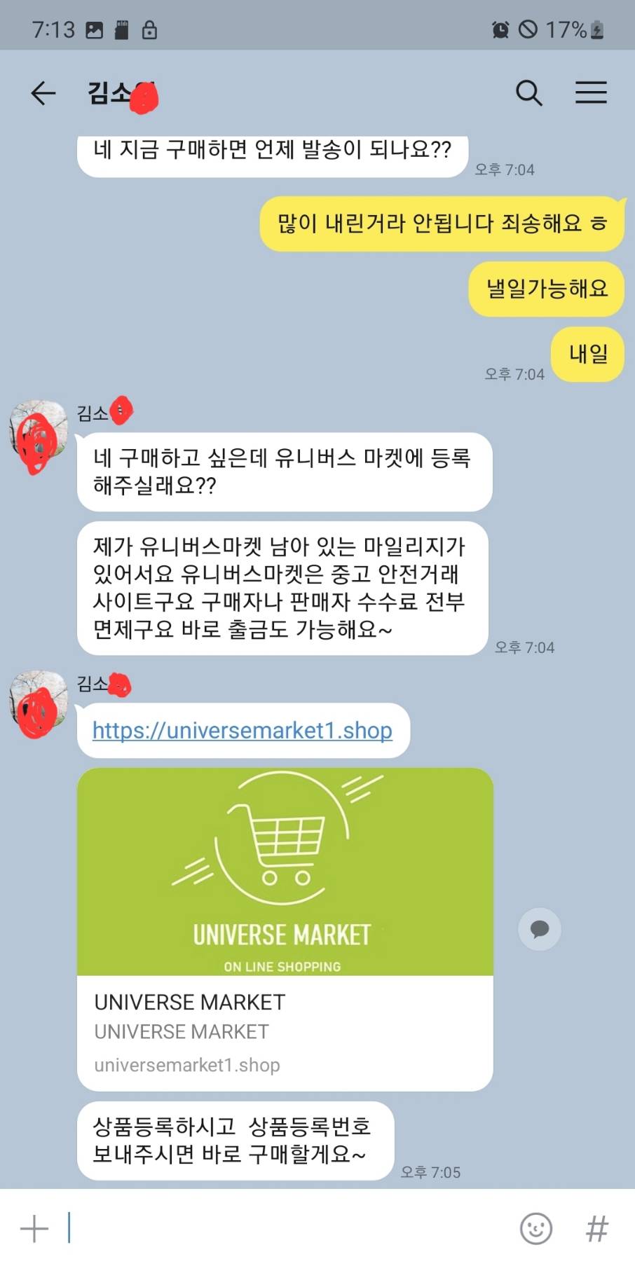 구매하고 싶다면서 생전처음듣는 유니버스마켓에 마일리지가 있어서 그걸로 결제 하고 싶다면서 안전거래사이트라고