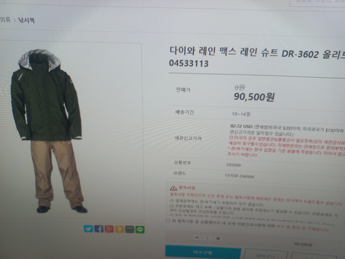 판매완료)))다이와 레인슈트(M)사이즈