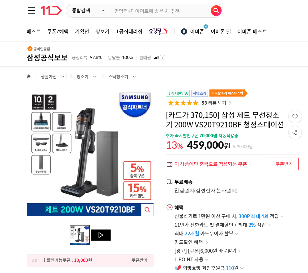 11번가에 물걸래킷트 제외 금액이 45.9만정도 합니다. 물걸래킷트만 10만정도인거 같습니다.포장도 안뜯은 미사용품입니다.
