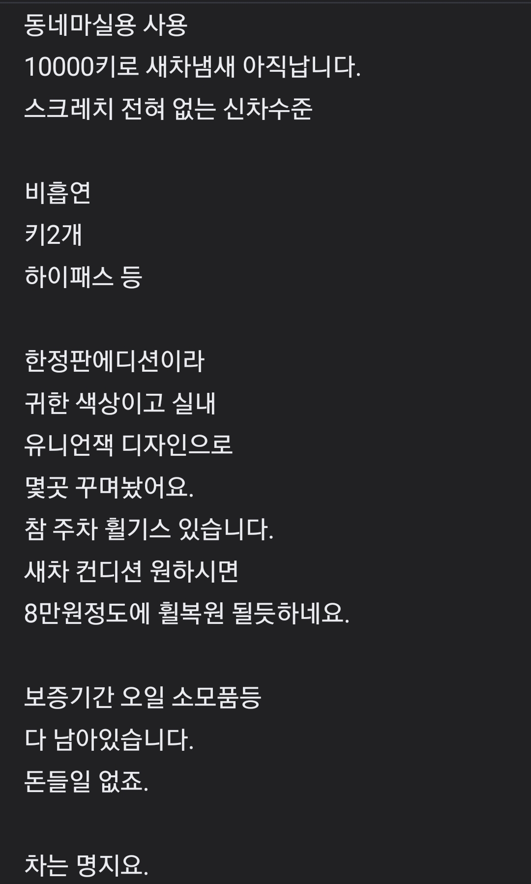 판매완료 55 검은바다 팝니다 1 521 0 2023.03.22 12:18 ■ 물품 기본 정보 1. 물품명 : 2. 판매지역 : 3. 물품상태 : 4. 거래방식 : 5. 판매가격 : 6. 연락처 : 경기가 안좋으니 싸게 보내려해도연락만 오네요 ㅎㅎ인낚분이 연락오시면드립니다.모든정비 다 해뒀고요.새차냄새 납니다.0109연락주세요.부산 ■ 상세 설명 : 0 목록 글쓴이 90 63 Lv.55 55 검은바다 일반회원 1,996,217 (39.4%) 바다는 누구도 확신 할수없다. 다만, 많은 경험과 연습으로 예상할뿐... +1 03.22 판매완료 +12 02.14 업) 미니쿠페3 +7 02.08 미니쿠페3 로즈우드에디션 1만km +10 10.16 고급카페의자. 스웨이드 새상품 03.19 오니츠카 타이거 오트밀에디션
