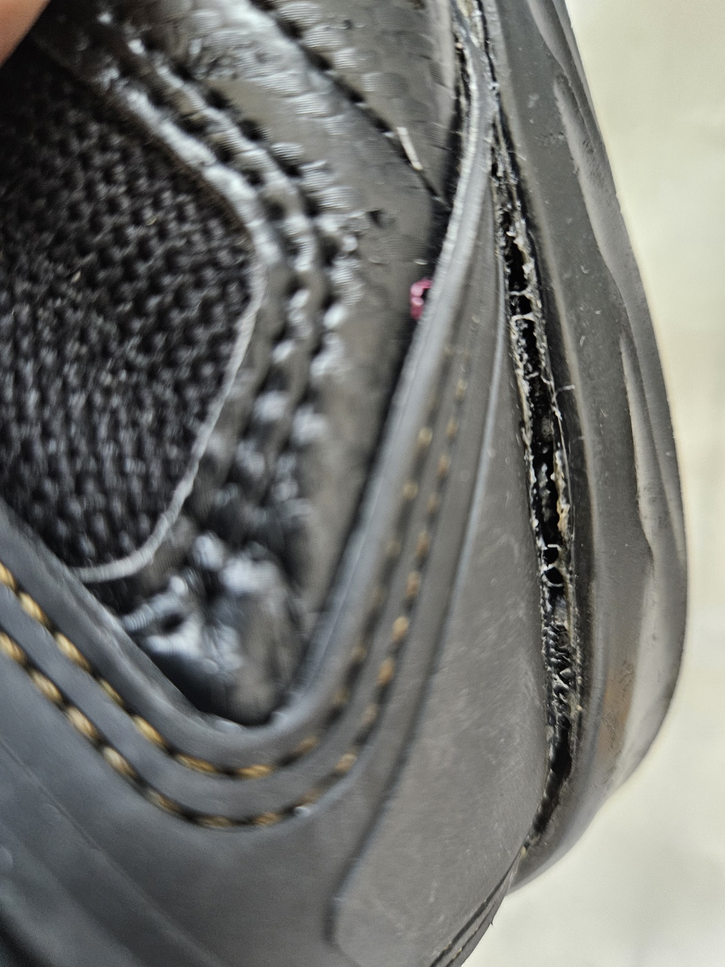 고어택스 천과 신발 밑창연결부분 고무 접착부분이 신발 옆,앞,뒷부분 바늘로 꿰메놓은 부분을 제외