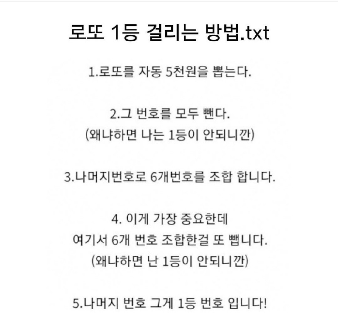 33 별공간 22-11-30 11:38 0 {이모티콘:innak-305.gif:50} 댓글 설정 댓글 신고 25 무쌍 22-11-30 12:30 0 {이모티콘:onion-070.gif:50} 댓글 설정 댓글 신고 24 감성6 22-11-30 13:44 0 일관성과 타당성이 확실해 보이네요...ㅎㅎㅎ 일관성과 타당성이 확실해 보이네요...ㅎㅎㅎ 댓글 설정 댓글 신고 13 두미도높은자리 22-11-30 15:24 0 아리까리하지만 복권방으로 고고!! 주말의행복을 맘껏 즐겨보자구여!! 다들 대박나세요!! 아리까리하지만 복권방으로 고고!! 주말의행복을 맘껏 즐겨보자구여!! 다들 대박나세요!! 댓글 설정 댓글 신고 12 바다매너 22-11-30 15:34 0 혹시 로또를 구매하면 진짜 이방법을 쓰는 것이 확률을 조금 높히는 것이군요~ 심박합니다!!! 혹시 로또를 구매하면 진짜 이방법을 쓰는 것이 확률을 조금 높히는 것이군요~ 심박합니다!!! 댓글 설정 댓글 신고 26 타래 22-12-01 15:29 0 오호 그럼저는 4등이 넘나자주 걸리는데 우째야하는지요? 오호 그럼저는 4등이 넘나자주 걸리는데 우째야하는지요? 댓글 설정 댓글 신고 1 하늘바다꽃 22-12-01 20:16 0 5천원짜리 번호를 모두 빼버리면 나머지 번호 6개는 어디서 나오는 건지 이해가 안되네요. 축하합니다! 행운의 바늘에 당첨! 269점 적립되었습니다! 5천원짜리 번호를 모두 빼버리면 나머지 번호 6개는 어디서 나오는 건지 이해가 안되네요. 댓글 설정 댓글 신고 21 K무사시 22-12-02 05:56 0 {이모티콘:onion-014.gif:50} 댓글 설정 댓글 신고 6 돌돔대마왕 22-12-04 17:09 0 로또 당첨확률 2배 높이는 비법 전수해드립니다. 만원을 사셨다면 2만원을 사보세요~,.~ 로또 당첨확률 2배 높이는 비법 전수해드립니다. 만원을 사셨다면 2만원을 사보세요~,.~ 댓글 설정 댓글 신고 11 무심유수 22-12-06 13:59 0 공감이 가네요 공감이 가네요 댓글 설정 댓글 신고 1 스치면챔질 22-12-07 16:37 0 {이모티콘:onion-035.gif:50} 댓글 설정 댓글 신고 2 소코바리 22-12-19 00:25 0 와 묘하게 설득력있네요 ㅋㅋ 와 묘하게 설득력있네요 ㅋㅋ 댓글 설정 댓글 신고