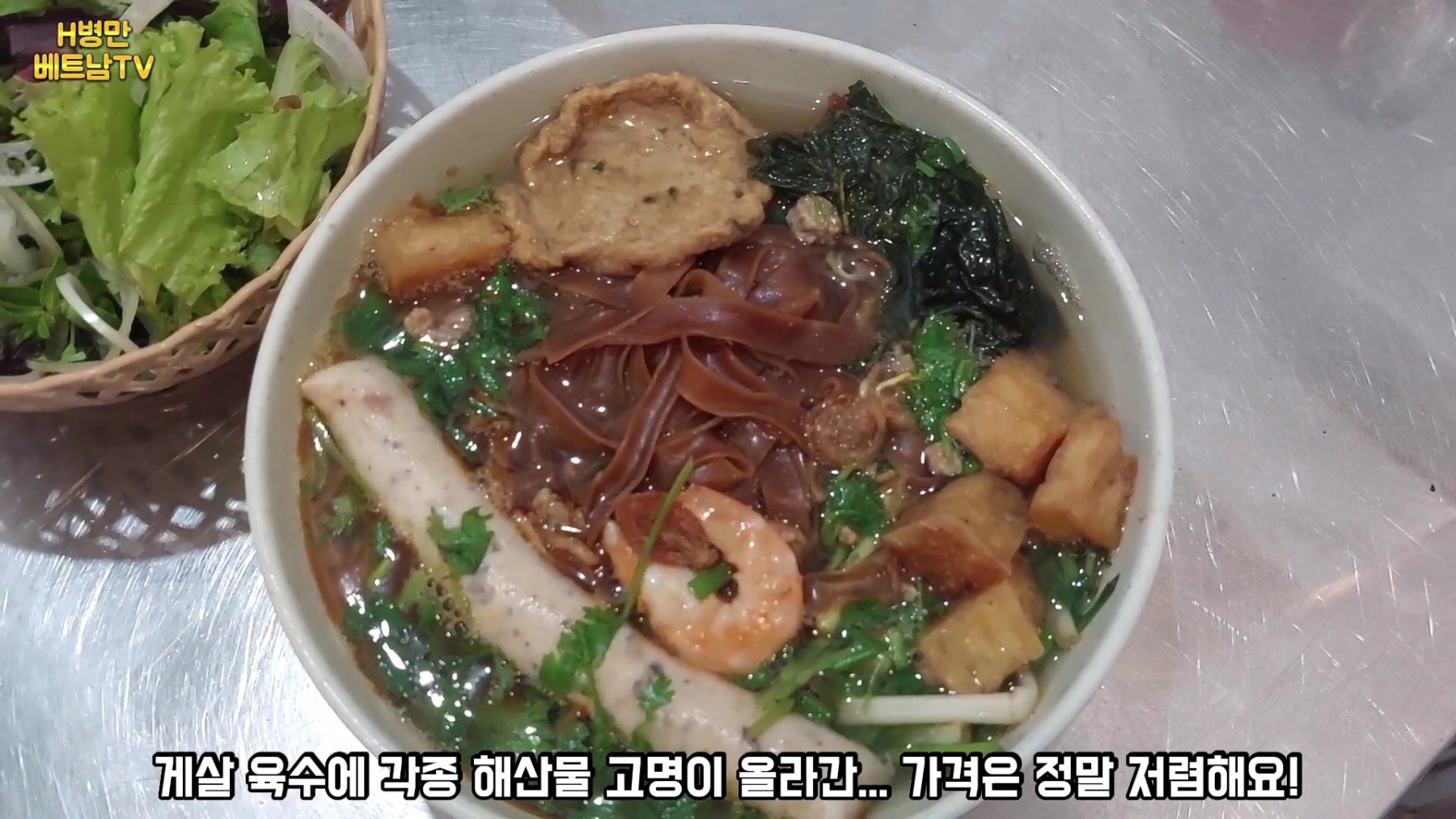 게살 육수에 많은 해산물 고명이 들어간 갈색 색깔의 두툼한 쌀국수인