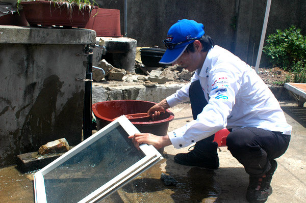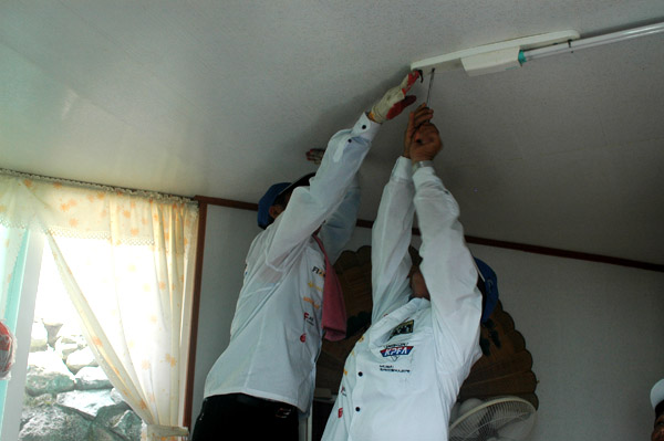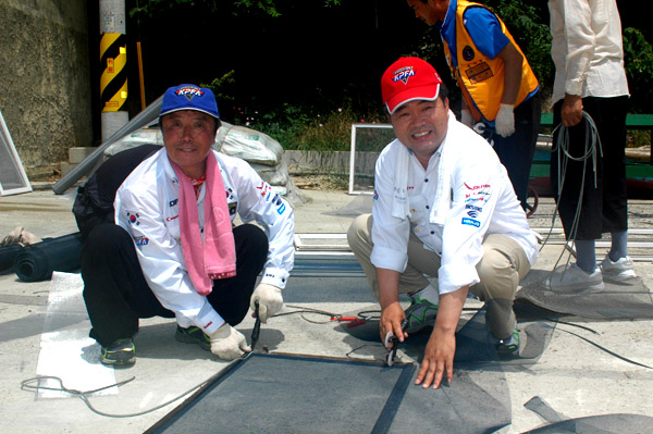 즐겁게 방충망 작업하시는 이병관 상임부회장님과 유병환 사무국장님