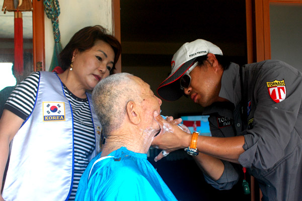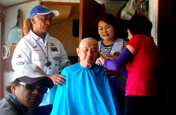 몸이 불편한 어르신께 이발 서비스 해주시는 라이온스 클럽 회원님들과 이병관 상임부회장님, 문종선 프로님