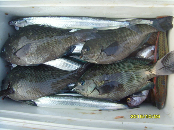 자리돔 조과물은 쿨러째 대구 조사님께 부어 드리고, 형광급 학꽁치 15수와 벵에돔 4마리는 챙겨옵니다.