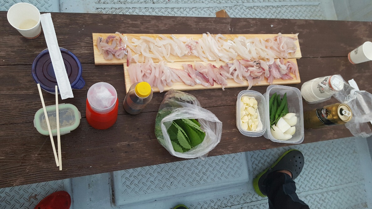 선장이 시작한지 얼마 안되어서 그런지 고기 안나오니 이곳저곳 포인트 이동도 자주해주시고 친절하게 해주네요.지금처럼하면 계속 이용할것 같네요.낚시하고6시30분에 철수하는데 선장님께 회떠주냐고 물으니 나와서 잡은고기로 회를 떠주신다고 하네요.배위에서 회를 떠주는데 그냥 대충 할줄 알았는데 제대로 회떠주시네요.상추랑 초장,간장 모두 준비가 되어 있네요.무엇보다 생와사비가 있네요.배 정박한곳 바리앞에 편의점이 있어서 소주몇병이랑 맥주 사와서 회랑 한잔ㅋ 임시 휴일에 제대로 바람쐬고 회 배터지게 묵고 왔네요.9월달엔 괴기들이 마니 잡히니까 그때오면 제대로 손맛입맛 볼수있다고 하셔서 9월달에 또 가봐야 겠네요.이상 허접한 글 읽어주셔서 감사 합니다.