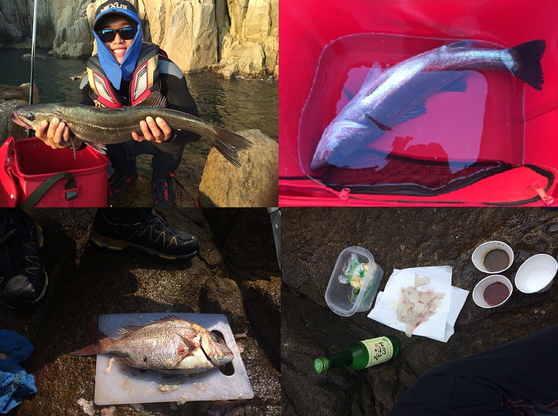 그렇게 날이 다밝고 올라오라는 벵에돔은 올라오지않고 방생급 상사리가 올라오네요. 그와중에 아버지께서 35정도 되는 참돔?상사리를 한마리 낚고 저에게도 입질다운 입질이 들어와서 랜딩하는데 묵직합니다. 처음엔 대물급 벵에돔이라 직감하고 아버지께 뜰채좀 가져다 달라구 부탁합니다. 그렇게 살짝 고기를 띄우고 보니 은색빛깔이긴한데 먼가 좀 깁니다..아버지께서는 부시리네 하면서 저보고 마무리하라고 하시면서 뜰채를 그냥 나두고 휙가버리시네요..그렇게 랜딩을 계속하는데 바로 고기가 바로 앞까지 왔는데 뜰생각을 안하고 계속 대를 가져가네요. 이때까지 낚시하면서 브레이크를 써본적이 없는데 대를 가져가니 자연스럽게 브레이크를 쓰게되더라구요. 역회전소리 정말 황홀하더군요 -0-..그렇게 아슬아슬하게 고기를 띄우고 보니 70정도되는 농어네요;; 얼른 살림망에 넣고 또 낚시에 집중하는데 아버지께서 옆쪽에서 벵에돔 한마리 낚으셔서 저도 얼른 그쪽으로 자리를 옮겨 낚시를 해보니 몇마리 낚이네요,.그렇게 대상어도 잡고 손님고기로 참돔 농어까지 손맛 제대로 본 하루였네요.