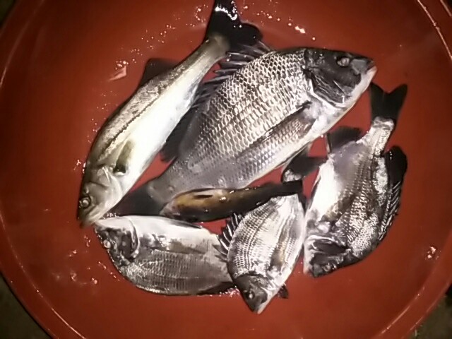 11시 만조시간에 철수 했습니다 내일 03시에 지세포가기로 약속이 있기때문에 눈 잠깐 붙치기위해 초날물 못 보고 돌아왔습니다 3시간의 저녁짬낚에 잡은 감성돔과 깔다구 수족관에 키핑하고 오늘 지세포 강성호타고 벵순양들 모셔와서 공동 하우스흘 이루어 주었습니다 벵순양은 사진을 못 찍었네요 감성군 44센치
