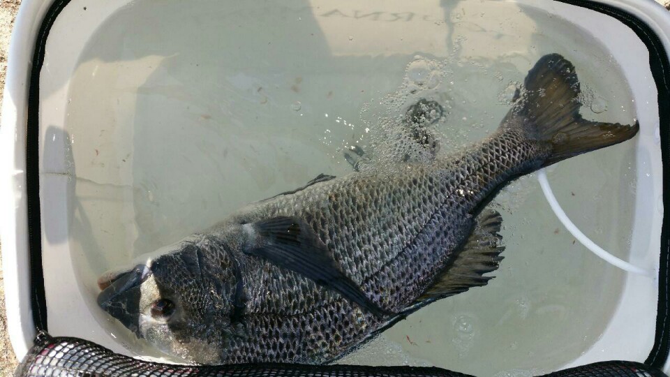 1.5호 목줄로 버텨내기기 너무 힘들어서 겨우 버티고 있다가 힘이 빠질길래 살살 감아내니 물 위에 떠 오르는것은 큰 감성돔이였습니다.