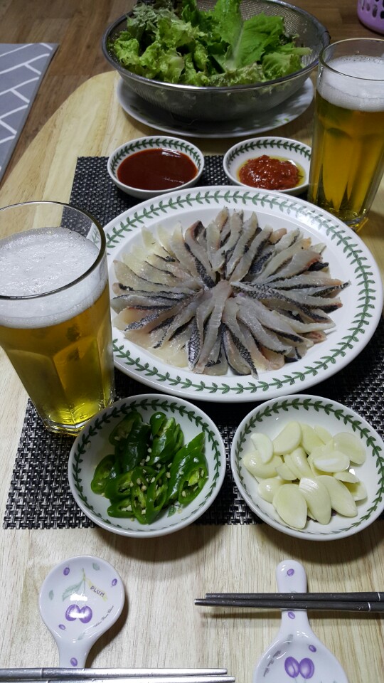 곧장 대구에 있는 집으로 와서 마눌이랑 맥주 한잔과 맛있는 벵에돔 숙회로 오늘 하루의 피로를 날려 보냅니다 ^^