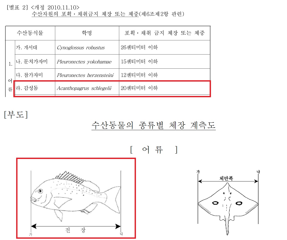 감성돔 포획 금지 체장 : 20CM 이하로