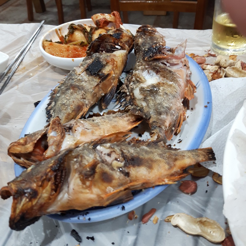 그러다가 14:00 오렌지 달량진 철수배가 온다, 부랴부랴 청소후 철수, 손가락으로 아가미를 찢어내 피를 빼고 섬사랑호 남성리 선창에서 밑밥통 씻고 귀광, 단골 회집 회, 구이. 맑은탕 수고비도 안받고 술값만 받는 서비스 감사