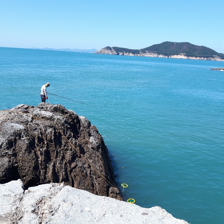 낚시인의집 사장님 서울 결혼식 가 텅빈 민박집 뒤로 하고 권덕리로 바로 간다. 거미줄 헤치고 부러진 소나무 넘고 낮은 포목 끼어가고 갯바위가 나오자 제주도 사수도,여서도 ,거문도, 삼부도가 다 보이는 가스없는 좋은날씨, 뱃줄타고 가방 받고 힘든 유격갯바위